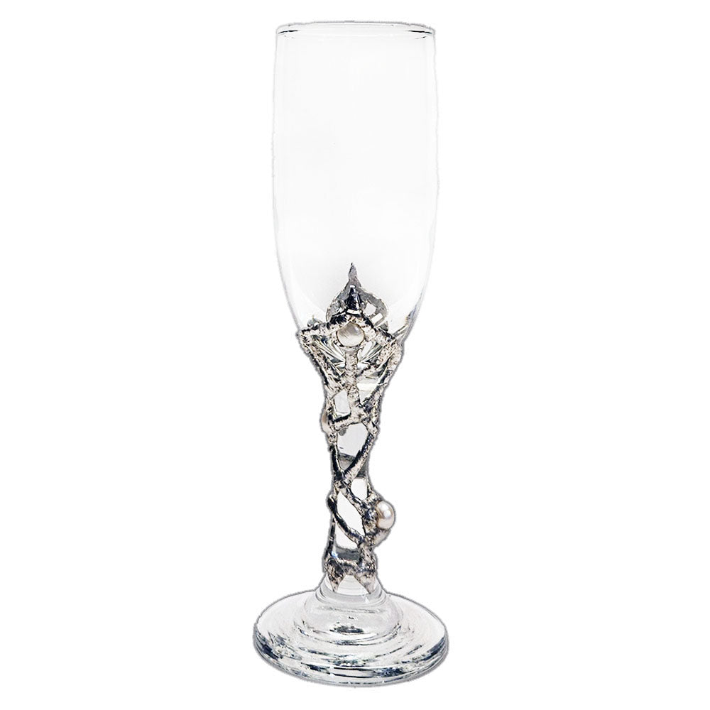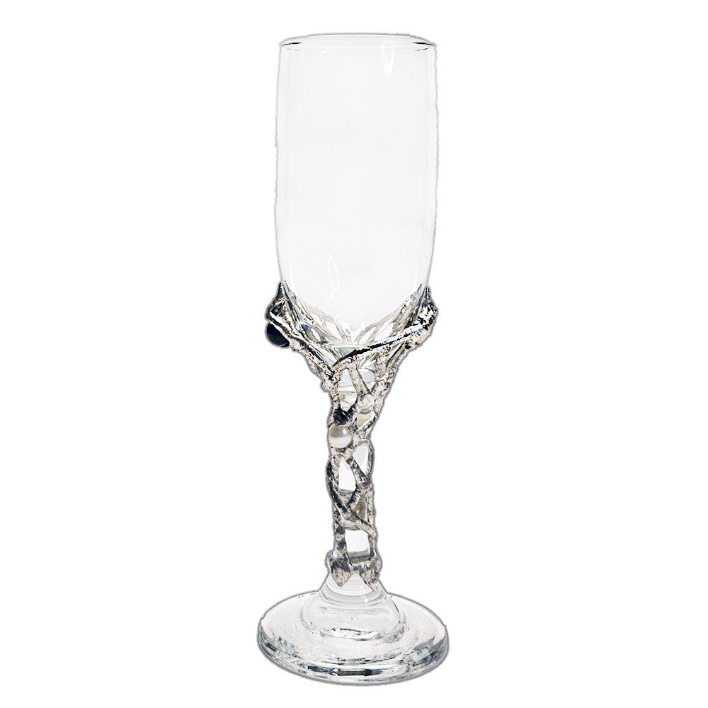 This champagne glass is adorned with a radiant amethyst sphere, its deep violet hue symbolizing clarity and sophistication. Surrounding it are three luminous white pearls, each adding a touch of purity and timeless grace. Together, these accents transform the glass into a jewel-like treasure, where gemstone brilliance and pearl elegance unite in perfect harmony.