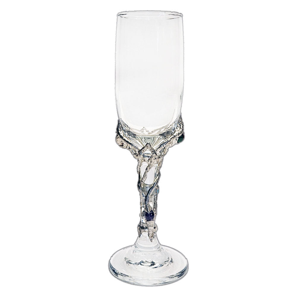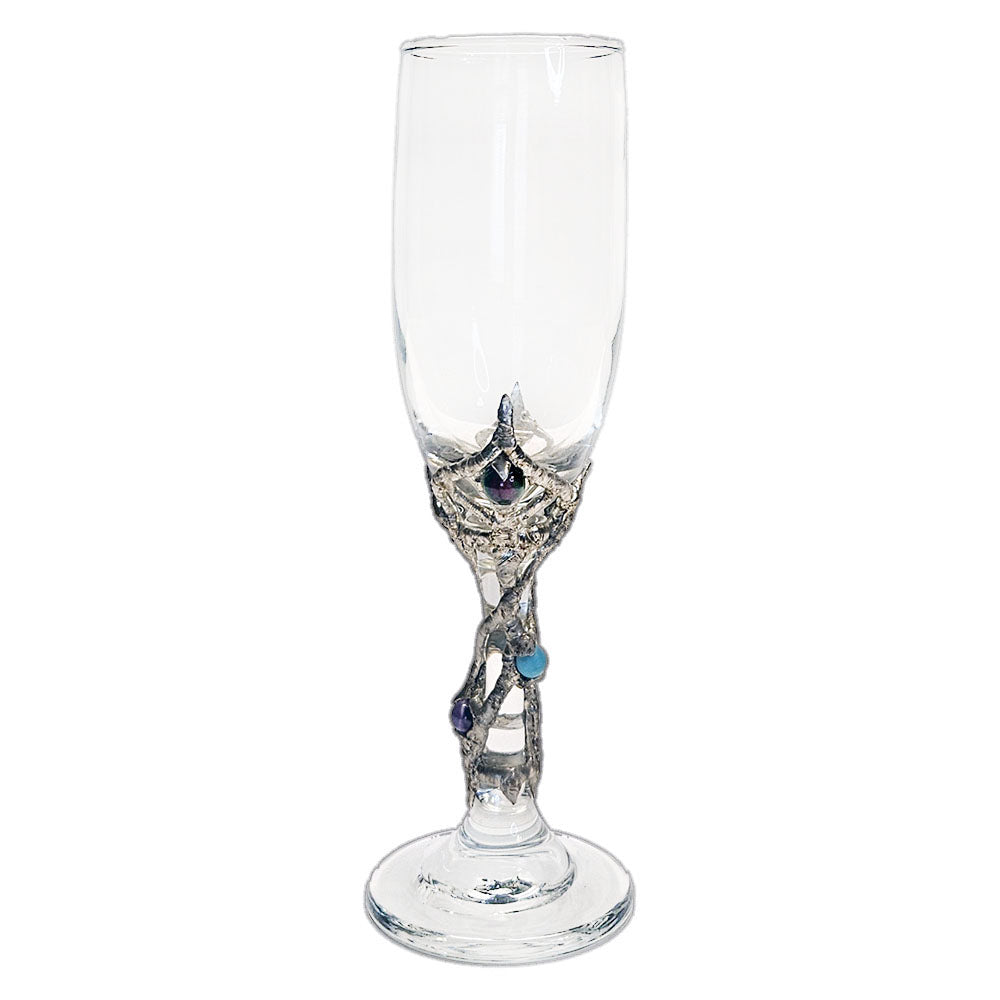 A champagne glass crowned with gemstones, where ruby-zoisite and moonstone meet amethyst and turquoise in a symphony of elegance. At its center, the ruby-zoisite sphere radiates vibrant energy, harmonized by the moonstone’s ethereal glow. Along the stem, a delicate amethyst ball and turquoise accent bring balance and refinement, transforming the glass into a jewel-like masterpiece.